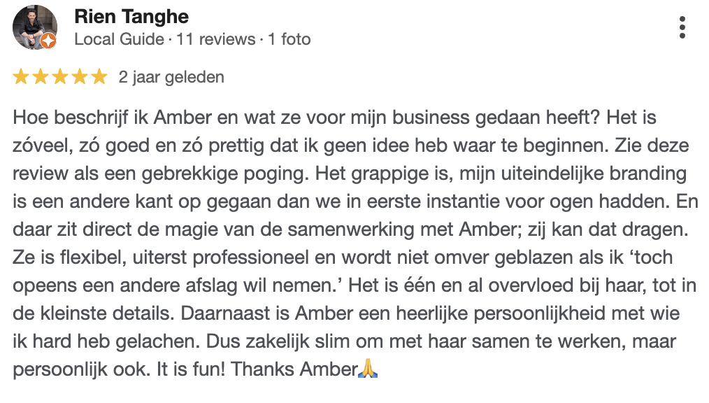 “Al bijna een jaar lang hikte ik aan tegen mijn nieuwe website. Wat wil ik eigenlijk aan gaan bieden? Welke teksten zouden daarvoor aansprekend zijn? Alles zat al wel in mijn hoofd maar om dat goed op papier te krijgen bleek een worsteling. Op aanbeveling van een vriendin met een goedlopende business vroeg ik een matchcall aan met Amber. Waarom zou je het zelf doen als er mensen zijn die hier hun expertise van hebben gemaakt? De hele rebranding past veel beter bij mij en het aanbod. Het is een investering maar als ik zie wat het ons heeft opgeleverd en hoeveel Amber voor ons heeft gedaan was ze meer dan het dubbele waard geweest! Amber is goud. Ze denkt met werkelijk ALLES mee, barst van de energie en de creatieve ideeën. Ik gun iedereen Amber, zonder haar was mijn hele bedrijf een hoofdpijndossier geworden en nu barst ik van de energie door de nieuw ingeslagen weg. De reacties op de rebranding zijn louter positief en ik weet zeker dat het een groot succes gaat worden. Dankjewel Amber, ik ken niemand die zó hard werkt en zo snel zoveel mooie resultaten weet te boeken!”